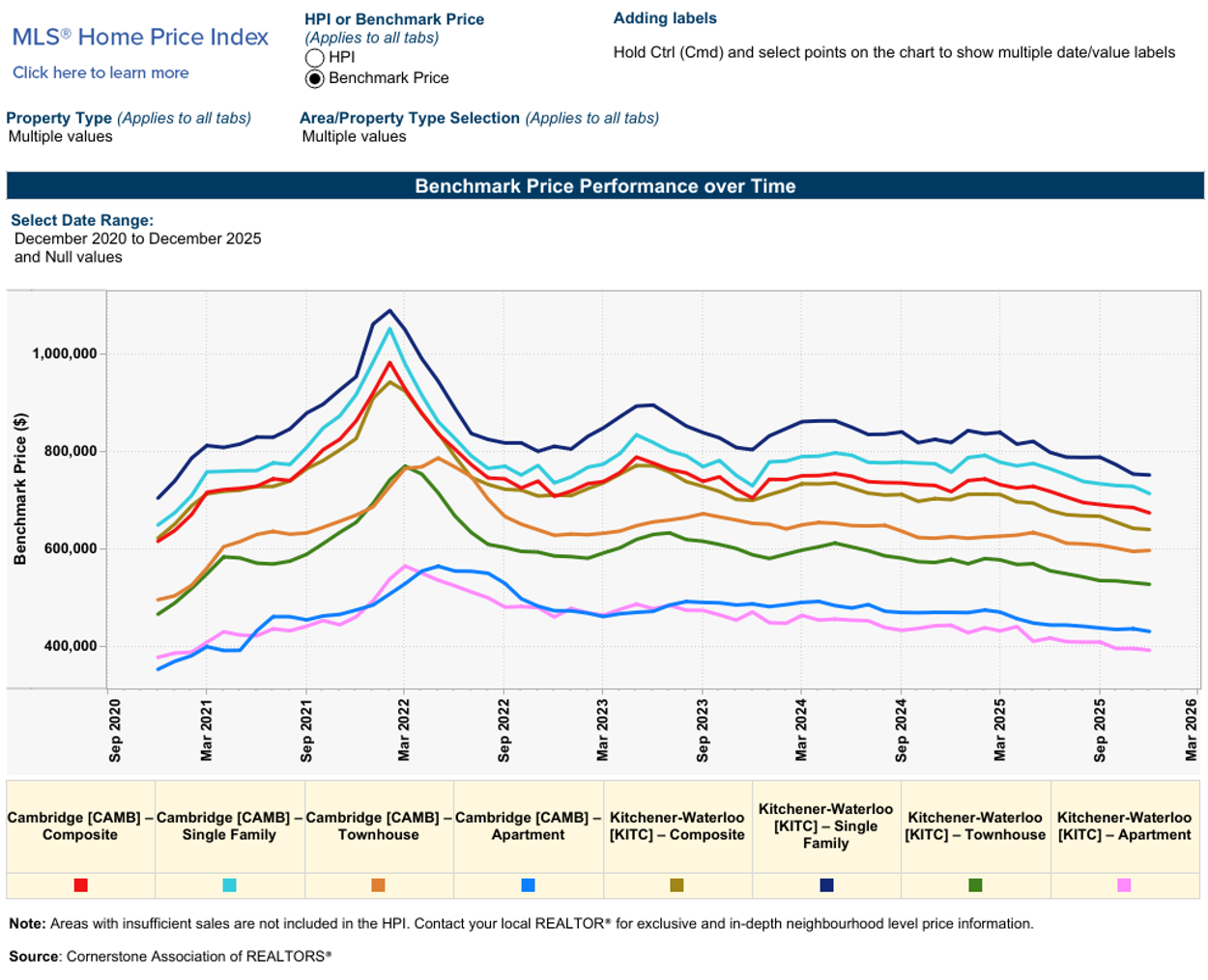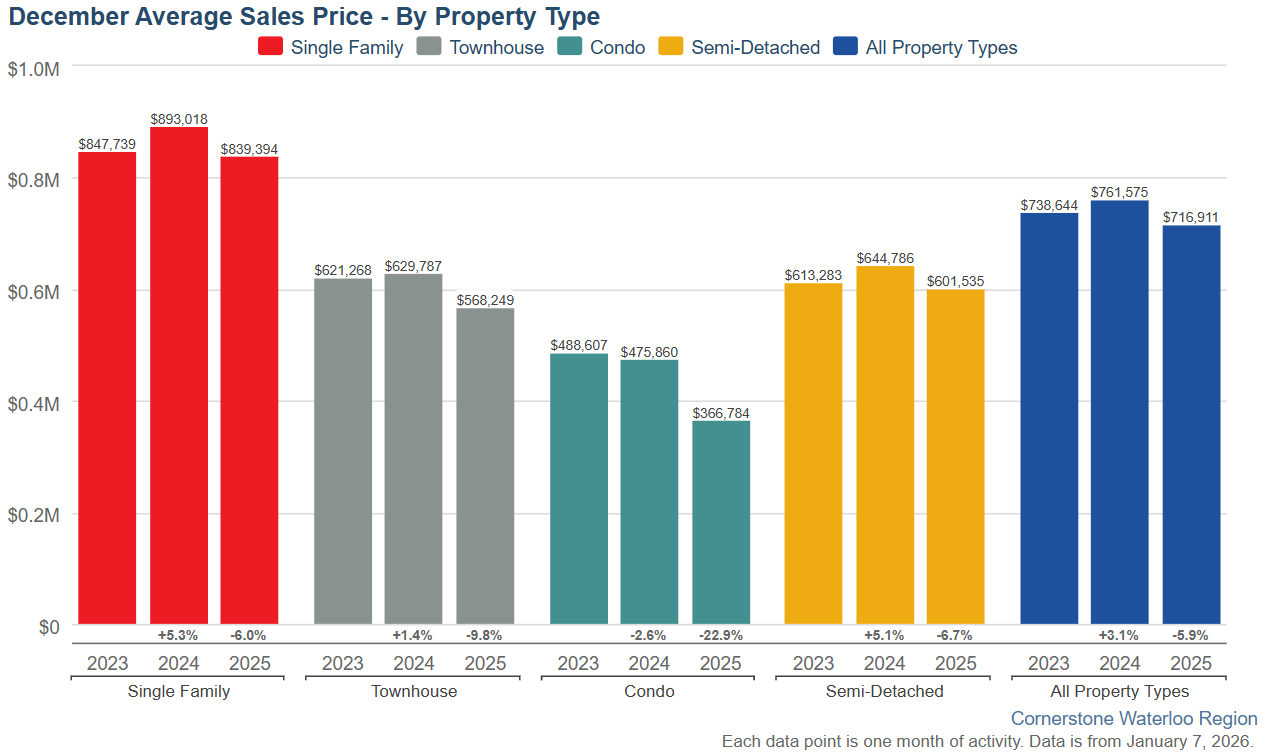 In December, the average sale price for all residential properties in Waterloo Region was $716,911. This represents a 5.9 per cent decrease compared to December 2024 and a 0.5 per cent increase compared to November 2025.
